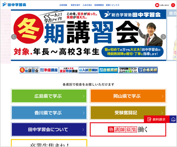 田中学習会は中国エリアにある地域密着型の学習塾です。勉強の成績だけでなく、受験を通して意志力、精神力、問題解決能力も培っていくという独自の教育理念を持っています。広島大などの難関大学への合格者も多数輩出。総合的な応用力が身に付くカリキュラムで、普段のテストから受験本番まで、幅広い対応力を養うことができます。