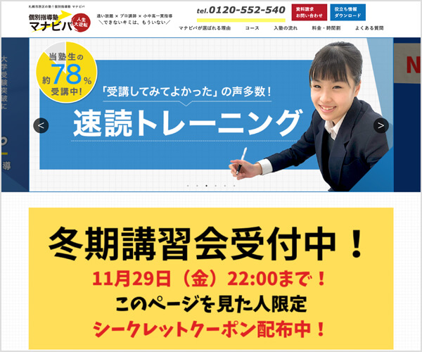 北海道大学など難関大学にも多数合格実績があり、学習効果を最大化する指導方法に定評があります。 全国に約320校を展開し、小〜高までの個別指導も行っています。 各教室には責任者や担任となる教師ほか、15名から20名の時間教師がいて、生徒の指導に当たります。 学習目的に合わせた専用のカリキュラムと、一人ひとりに合わせた学習プランが用意されるなど、じっくりと受験対策が行える予備校です。 |